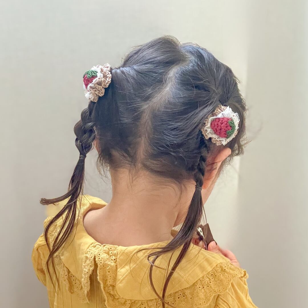 艶感のあるレース糸を使って編んだヘタを付けました。